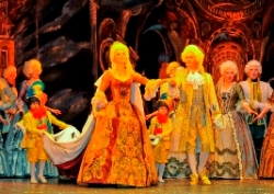 Не знаю, видела ли Ольга Иванова, режиссер нынешних «Черевичек», тот легендарный спектакль, но она попыталась всеми средствами реанимировать эстетику старого Большого на крошечной сцене Камерного театра. Все здесь «всамделишно», все напоминает о так милой сердцу простого зрителя «реалистичности» классических постановок прошлого: запорожцы в шальварах и с саблями наперевес, дивчины – в венках с лентами, екатерининские придворные – в париках и кринолинах и т.п. Крошечный задник сцены последовательно украшают живописные картины то заснеженной Диканьки, то звездного неба, по которому Вакула несется в Петербург, то царских чертогов эпохи рококо. Развернуться в объемах театра на Никольской в общем-то негде, поэтому постановщики (вместе с Ивановой художники Ирина Акимова и Юрий Устинов) делают сценическое пространство как бы трехслойным, активно используя занавесы и тюли для создания всяких «волшебств» и «эффектов». По традиции Камерного персонажи активно внедряются в зрительный зал, то тут, то там появляясь из боковых дверей и оказываясь посреди публики. В результате мы получаем добрый старый стиль, то, что принято называть иллюстративным спектаклем в чистом виде, на который смело можно вести детей практически любого возраста: все понятно, все очевидно.