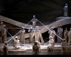 Показать грандиозного «Набукко» на малюсенькой родной сцене театра на Большой Никитской (разумеется, еще в 2005-м, до начала реконструкции), или на так же не слишком просторной нынешней на Новом Арбате не представляется возможным. Конечно, Бертман умудрялся ставить и «Аиду», и «Бориса Годунова» в камерном формате, но для адаптации французского или питерского «Набукко» потребовалось бы слишком много усилий. После долгих мытарств решено было все-таки представить эту работу в полуконцертном варианте: в первый день весны на сцене Дома музыки солисты в «исторических» костюмах попытались инсценировать драматические коллизии далекого прошлого. Своими силами – никакой Гулегиной, увы, не наблюдалось.