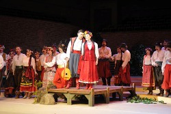 В Мариинском театре она была отдана на откуп молодежи: под руководством Ларисы Гергиевой репетировали и пели премьеру сплошь вчерашние и сегодняшние студенты Академии молодых певцов театра. За дирижерский пульт встал представитель молодежной генерации мариинского дирижерского корпуса Туган Сохиев, а за сценическое решение ответственность нес молодой питерский актер, только пробующий свои силы в режиссуре, Александр Маскалин. Искать в работе Маскалина «чего-то эдакого» - абсолютно бесперспективное занятие. «Майская ночь» поставлена совершенно традиционно – по периметру сцены расставлены плетеные изгороди с глиняными горшками вверх дном, пара грубо сколоченных телег, буйной малороссийской растительностью убраны другие элементы сценического оформления, парубки разгуливают в шальварах всех цветов радуги, а дивчины – в венках с лентами в косах, словом, самая что ни на есть гоголевская Украина воспроизведена с дотошной аккуратностью. В третьем, фантастическом акте появляется деревянный помост над воображаемым заболоченным прудом, вокруг которого русалки в белых полупрозрачных хитонах и серебристых коронах разной конфигурации водят хороводы. Когда приходит черед кому-то петь – хору или солисту, или ансамблю певцов – исполнители выходят на авансцену и, не слишком озаботившись потребностями драматического положения, логикой спектакля, упоенно вокализируют. Все просто, однозначно, узнаваемо: традиционный оперный театр, призванный ублажить зрителя красивой картинкой и прекрасным пением.