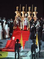 В 2009 году программу 55-го юбилейного сезона Фестиваля Пуччини составили четыре оперы композитора. «Богема» и «Турандот» – репризы последних фестивальных постановок. «Тоска» и «Манон Леско» – премьеры нынешнего сезона. В дополнение к этому финальным аккордом музыкального смотра стал оперный гала-концерт Анжелы Георгиу при участии Влада Мирицы. Он состоялся 23 августа: в этот день место за дирижерским пультом оркестра фестиваля занял Альберто Веронези. Отметим, что в фестивальные программы нескольких последних лет стали включаться один-два балетных названия: в этом году, к примеру, «Лебединое озеро» и «Жизель». Но поскольку это никак не связано с творчеством Пуччини, балетную программу следует рассматривать просто как «коммерческое дополнение» программы оперной. В этом году автору этих строк удалось заскочить в Торре дель Лаго всего лишь на один спектакль – и наш дальнейший рассказ будет посвящен новой постановке оперы «Тоска».