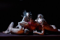 Голую сцену и минимум вещей на ней дополняет удивительная сценическая находка: нечто вроде низенького «трюма», подпола, куда можно съехать, как по горке на детской площадке, если надо спрятаться, подсмотреть, уговорить обиженную дамочку. И этот же «трюм» становится адом, куда в финале проваливается грешный герой, и где в виде языков пламени выступают полностью обнаженные мимы. Они-то и хватают нераскаявшегося грешника и, кажется, пожирают его: полная иллюзия ужасного наказания...