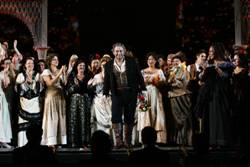 Оставили на афише два спектакля аргентинского дизайнера и режиссера Хуго де Ана – и вполне заслуженно. "Тоска" 2006-ого года и "Севильский цирюльник" 2007-ого в годы премьер были истинными бриллиантами. Спустя пару лет они сохраняют значение и очарование, но чуточку померкли. "Тоска" в стиле гран-гиньоль, с подчеркиванием атмосферы страха и подозрительности, с величественной сценографией, в которой доминируют элементы знаменитой статуи Ангела, что стоит на верхней площадке бывшего мавзолея Адриана, и "Севильский цирюльник", действие которого происходит в лабиринтах регулярного парка на французский манер, а персонажи в разноцветных и блистающих роскошью костюмах напоминают жеманные фарфоторые статуэтки,- спектакли абсолютно разные, полные фантазии и увлекательные. Возможно, в том что оба они “поскучнели”, вина певцов: премьеру "Тоски" пели Фьоренца Чедолинс и Марсело Альварес, пели великолепно, в нынешнем году на их местах тенор Марчелло Джордани, лишенной харизмы и с проблематичными верхними нотами (ария "E lucean le stelle" ему, однако, покорилась), и молодая украинская певица Оксана Дыка, которой не отказать в голосе и внешности, но которая совершенно не готова к роли римской примадонны, дивы, любимицы самой королевы. Пьер Джорджо Моранди дирижирует предельно обобщенно, как если бы симфоническое богатство пуччиниевской партитуры не слишком увлекало его.
