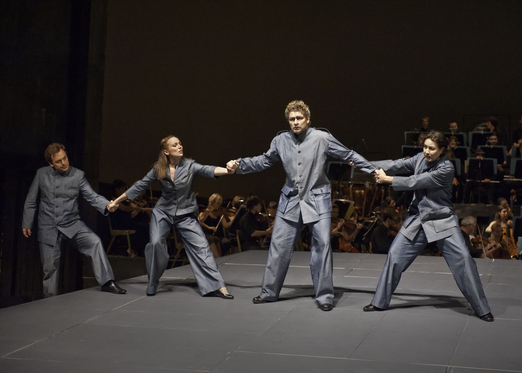 Наклонный помост в Мейстерзингерах остается, не обошлись без простых предметов мебели и аксессуаров: табуретки, стол, пара деревьев. Для редкой у Вагнера комедии Кун приберег простую, но счастливую находки: все герои у него одеты в современные костюмы, поверх которых наброшены наряды по моде высокого Возрождения, сшитые, однако, из прозрачных струящихся тканей. В первом действии, когда мейстерзингеры не принимают новаторской поэзии Вальтера, они из вполне современных достойных господ превращаются в персонажей картин Гольбейна и Кранаха, а в третьем действии, признавая победу молодого героя, принимают знакомый нам облик.