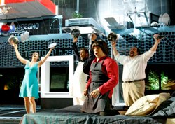 Режиссер спектакля венецианец Дамиано Микьелетто, дебютировавший на фестивале два года назад совершенно абсурдистской постановкой «Сороки-воровки», на этот раз весь минитеатр французского комического абсурда, приправленный итальянскими страстями и ариями, заключил в обстановку современного жилого интерьера. Техническое осуществление замысла стало возможным благодаря сценографу (заодно и художнику по костюмам) Паоло Фантину. На едином пространстве сцены располагаются гостиная (она же столовая и кухня), спальня, подсобка и, конечно же, санузел. А чтобы в глазах зрителя одновременное присутствие разноплановых картин не сливалось в одну, над всей этой сценографией возвышается огромное наклонное зеркало, в котором отражается полный «поэтажный план-экспликация» жилища с обозначением дверных проемов между помещениями и их названиями, написанными на полу. Очень интересное зрелищное решение: за жизнью персонажей можно наблюдать как в реальном, так и в виртуальном измерении. Благодаря отражению в зеркале замечательно решена сама шелковая лестница: кажется, что в глубине сцены к саду возле дома подходит человек и забирается вверх по длинной белой веревке – на самом деле он просто подходит к низкому оконному проему и, залезая в него, оказывается в комнате. Постановка вышла живой, искрящейся обилием зажигательных мизансцен, которые – создается именно такое впечатление – режиссерски проработаны с певцами буквально до мелочей. Нынешняя постановка «Шелковой лестницы» – третья за всю историю фестиваля и первая новаторски смелая в плане концепции постановочного решения, но, к счастью, в конструктивной позитивности ей отказать невозможно.