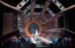 Где здесь греки, где троянцы, где тирийцы с карфагенянами, разобрать трудно – все на одно лицо космонавты в мягких хоккейных костюмах со шлемами-скафандрами. Само же сценическое пространство этой постановки по большей части «девственно чисто», пусто и угрюмо. Время от времени оно наполняется какими-то монстрами театрального конструктивизма. Это и инсталляция троянского коня в форме светящегося яйца с клювом и крыльями в виде кристаллов солнечных батарей, а также с подвешенным внутри вниз головой эмбрионом-акробатом, изображающим Призрака Гектора, лазутчика в диверсионном отряде греков. Это и кольца-магниты, ассоциирующиеся не иначе как с «Большим адронным коллайдером», снабженным системой гигантских надувных труб – подводящих коммуникаций. Нет сомнения: на сегодняшний день всё это просто безумно актуально! Особенно в музыкальном театре! Но «по совместительству» подобная инсталляция еще ведь и Карфагенское царство, которым правит Дидона и в котором ее трон вместе с ней, словно подчиняясь эффекту сверхпроводимости, всё время «парит» в магнитном поле на «невидимых» тросах! Это и орбитальная станция, которая висит над Карфагеном, и ждет когда же троянцы-марсиане во главе с Энеем, наконец-то, улетят на свою далекую планету основывать новое государство под названием Италия. Это, наконец, и тарелка-спутник (возможно, параболическая антенна для космической связи с покинувшим Дидону коварным Энеем). В перевернутом виде сей сценический артефакт становится погребальным костром Дидоны: надо только хорошо утыкать его десктопами ноутбуков, на которых не забыть запустить видео красных языков пламени, – что, не долго думая, и делается.