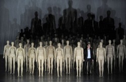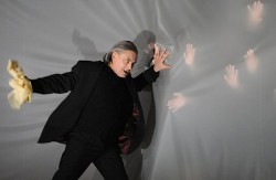 Вообще в постановке Херманна очень много намеков и ассоциаций, то Джильда (Олеся Головнева) сажает в землю в своем подвале цветы, эта «клумба» скорее напоминает маленькую могилу. То Герцог повязывает Маддалене пояс, снятый с Джильды. То Риоголетто отделен от придворных полупрозрачным занавесом, на фоне которого мы видим ладони, да и наконец манекены, которые заполонили все сценическое пространство.