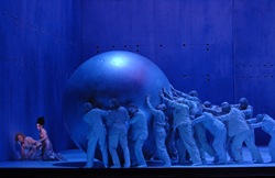 С первого взгляда действие "Нормы" проходит в цирке. И на фоне настоящих цирковых представлений с участием хористов оперы кипят нешуточные человеческие страсти: Норма и Адальжиза выясняют свои отношения с молодым героем Поллионом. Оригинальное содержание оперы – борьба галлов и Рима, роща друидов, жрецы и их роль в жизни Галлии – всё это ушло на задний план. А личные взаимоотношения героев вышли на первый план. Но у режиссёра есть по этому поводу определённый замысел: какие-то высшие силы давят на людей всё больше и больше (в глубине сцены огромный шар, который непрерывно увеличивается)… и люди сходят с ума. Таким образом, действие оперы по Муссбаху происходит в сумасшедшем доме, а все герои оперы безумцы, и поэтому хор, якобы, и участвует в цирковых представлениях. Но в поведении героев оперы ничего безумного нет. Вот такое сценическое несоответствие или, если хотите, контраст. По замыслу Беллини это сочинение о человеческих страстях, связанных в узел с борьбой Галлии за свою независимость от Рима, а режиссёр придал действию какие-то вселенские страсти. Нужно ли это?.. Ответом как бы является сама постановка!