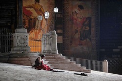 В минувшем сезоне было принято решение «облегчить» спектакль. Это по-прежнему перенаселенное, чрезмерно детализированное зрелище, напоминающее рекламный проспект, но, освободив задние ступени от тяжелых деталей оформления, сузив пространство благодаря системе разрисованных полотен (которые отсылают к старинной итальянской театральной традиции), престарелый мастер уделил больше внимания персонажам и с большей фантазией и логикой «развел» массовые сцены, что пошло на пользу спектаклю.