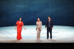 Но постановщики глюковского «Орфея» 2010 года Дитер Дорн (режиссура) и Юрген Розе (сценография и костюмы), похоже, не оценили всю значимость возложенной на них миссии по возвращению мифа после его столь продолжительного забвения, ибо особо перетруждать себя постановочными идеями просто не стали. Переодев героев античного мифа в современные одежды, они «быстренько состряпали» современный спектакль-концерт, который вполне можно было бы назвать «semi-stage» постановкой, если бы в нем не был применен ряд сценографических эффектов, связанных с появлением богов в первом акте и путешествием Орфея в Аид и Элизиум во втором! То расширяющееся, то сужающееся безжизненно голое пространство сцены однозначно иррационально с точки зрения «среды обитания» этого мифа: царство геометрических форм и объемов, в которых вынуждены существовать хористы, статисты-«манекены» и главные персонажи оперы зрительского доверия абсолютно не вызывает. Да и, надо сказать, ярких вокальных индивидуальностей эта постановка также лишена.
