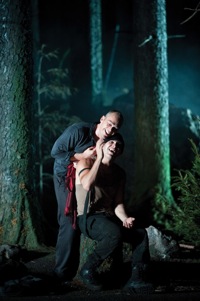Но оставим Верону ради чудесной прогулки по дремучему лесу, ведь увиденная в этом году постановка «Дон Жуана», моцартовского шлягера «всех времен и народов», также властно захватывает в плен, но совсем в ином визуальном аспекте. Этот «аспект» со своей легкой, или лучше сказать, легкомысленной руки, нам предложили Клаус Гут (режиссер) и Кристиан Шмидт (сценограф и художник по костюмам). Пожалуй, именно для этой постановки необходимо назвать еще художника по свету (Олаф Винтер), ведь световые пятна в темном лесном царстве важны как никогда. Любопытно, что постановка «Свадьбы Фигаро» Моцарта, которую я видел здесь в прошлом году, также принадлежит этой команде, но эти два спектакля, как ни странно, разделяет огромная интеллектуальная пропасть подходов к ним. И, наконец-то, настает время заметить, что даже при такой потрясающе живописной сценографии, которую нужно было созерцать на протяжении трех часов, глаз начинает предательски уставать. И это не мудрено, ведь между созерцаемым на сцене (хотя и эстетическим красивым, но монотонно однообразным) и локализацией оперного сюжета, как уже отмечалось выше, совершенно нет никаких точек соприкосновения. Те же немногочисленные артефакты «иного мира», будь то автобусная остановка, где Донна Эльвира натыкается на Дон Жуана и Лепорелло, легковой автомобиль, на котором по лесу «рассекают» Донна Анна и Дон Оттавио, или качели в чаще леса, на которых «резвятся» Церлина и Дон Жуан, – вовсе не те зрительные пятна, чтобы на них отдыхал глаз. В течение финальной сцены – пикника, устроенного на лесной поляне Дон Жуаном и Лепорелло – живехонький Командор сам преспокойно копает могилу для своего убийцы: зрелище жуткое, но абсолютно реалистичное! Глаз же в полной мере отдыхает исключительно на очень колоритных (пусть даже и идущих вразрез с либретто Да Понте) актерских типажах, а сознание просто растворяется в их вокальном мастерстве и превосходно поставленных технически голосах. Причем весь ансамбль певцов оказывается на одинаково высоком уровне!