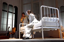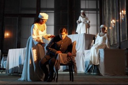 То, что в предыдущей части обзора изложено в качестве подлинного оперного сюжета, и то, что предстает взору публики на фестивальном спектакле, – вовсе не одно и то же. Постановочная команда в составе режиссера Дамиано Микьелетто, сценографа Паоло Фантина и художника по костюмам Карлы Тети уцепилась «мертвой хваткой» за то обстоятельство, что Сигизмунда мучают приступы душевного расстройства, поэтому весь первый акт происходит в психушке. В финале первого акта, после того, как Сигизмунда навещает Эджелинда-Альдимира (теперь она – «дочь» лечащего врача Дзеновито) и несчастному монарху становится несколько лучше, его, наконец-то, «выписывают». Весь второй акт разворачивается абсолютно в той же конструктивной сценографии (только со сменой белых больничных покоев на интерьер фешенебельного кабинета «под дерево»).