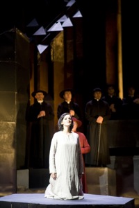 Вот теперь весьма уместно поговорить собственно о режиссуре и сценографии. Среди достоинств первой, как уже говорилось выше, ненавязчивость, отсутствие вычурности, если хотите, подчеркнутая и традиционная оперность. Например, большинство важнейших вокальных фрагментов певцы исполняют фронтально в классическом духе. Таким образом, обобщенно-внешний рисунок режиссуры внятен и не вызывает отторжения. Однако это отнюдь не означает, что должна отсутствовать тщательная «мелкая пластика» мизансцен. Общение героев, их «физическое взаимодействие», сцендвижение, на мой взгляд, достаточно тонко непроработаны, или недорепетированы. В действии много неуклюжих поведенческих и сценических моментов, начиная со случайного убийства Калатравы (стоящего гораздо выше, чем упавший на пол пистолет!?) и кончая противоборством Карлоса и Альваро. Про финальную сцену убийства Леоноры я уже говорил. Несколько «вампучны» по пластике и массовые сцены, особенно с участием Прециозиллы. Здесь можно было бы проявить больше фантазии. Под стать неточной режиссуре и сценография, чего от опытного мастера Сергея Бархина я уж никак не ожидал. Использование одной и той же скалообразной (или замкообразной) с многочисленными уровнями архитектурной конструкции, которая при помощи, в основном, световых решений превращает сцену то во дворец маркиза ди Калатравы, то в горный монастырь, то в скалистое ущелье, где притаился монашеский скит, не нова, я бы даже сказал банальна. На такие мелочи, как то, что эта конструкция уже не вполне подходит по стилистике к деревенской таверне или военному лагерю в лесах Италии, создатели спектакля (прежде всего сценограф) уже и внимания не обращают! Конечно, конструкция могла бы быть совершенно условной, но тогда уж и во всем таковой, а не частично. Нет ничего хуже половинчатых решений. А уж то, как технически была исполнена декорация!.. (случайная ассоциация – куда уж лучше были «сработаны» в свое время скалы в постановке «Валли» Каталани в Новой опере). Как говорится, нет слов! Точнее есть одно словечко, несколько грубоватое – халтура! Наспех сколоченная из какого-то старого подручного материала, напоминающего оформление дежурных агитационных мероприятий Домов культуры советских времен, она не отвечает не только «высокому» духу произведения, но и вообще неуместна в современном театральном здании, совсем недавно открытом после реставрации. И наличие достаточно изощренной световой партитуры талантливого художника по свету, отражающей настроение той или иной сцены, не могут спасти положения. Такие вот нелицеприятные вещи приходится иногда говорить, как ни прискорбно. О чем еще сказать! Об условности псевдоисторических костюмов! Она, пожалуй, уместна. Открытий здесь нет, но они и не нужны!