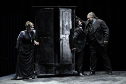 Концепция молодого, но уже известного немецко-турецкого режиссера Иммо Карамана вряд ли может восприниматься как исходящая из музыки. Скорее она не имеет к ней никакого отношения. Появление героев из шкафов, обставленное столь своеобразно, вероятно, должно воплощать идею их одиночества в мире. Однако вид заброшенного жилища и темной мебели, из которой неожиданно возникают люди, ассоциируется скорее с детскими страхами. Ассоциации с призраками и привидениями подчеркивает вид и поведение весьма активного на сцене хора. Фантазия режиссера превращает хористов в лемурообразных существ, одетых в черное, с темными тенями под глазами, — поющих и танцующих вампиров. Даже, изображая гостей на дне рождения Луизы в первой сцене оперы, они кажутся саркастически-враждебными, зловещими. Возникающие в дальнейшем к месту и не к месту хористы и миманс создают впечатление насмешливых и докучливых соглядатаев, своеобразно «оживляющих» обстановку.