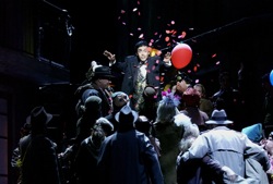 А что же музыка? И музыка на высочайшем уровне, в зале чувствуется ток теплоты и симпатии, исходящий от дирижера Эвы Каспари. Как передать любовь в звуках? В тот вечер оркестру Фольксопер это удается: он звучит с огромной проникновенностью, много раз повторяющуюся мелодию дуэта «Bist Du’s lachendes Gluck» струнные «поют» так, что способны исторгнуть слезы. Помогают верные темпы, радуют безупречно отработанные ансамбли. Урсула Пфитцнер — Ангелика — подлинная королева вечера. Это большой, полный, красивый голос чуть терпкого тембра. Ее сольные куски — настоящий праздник пения. Однако Пфитцнер еще и прирожденная актриса с отличной фигурой и выигрышной внешностью: чего еще желать от исполнительницы главной роли? А вот ее знатный муж, он же bohemienne, изрядно портит дело: у английского тенора Стивена Чонди нет ни обаяния, ни интересного голоса, на сцене он предстает бледным и неуверенным в себе, порой его плохо слышно. «Каскадная пара» Юли и Манфред — Элизабет Шварц и Томас Зигвальд — лихо «перетягивает одеяло на себя», блеснув и отличным вокалом, и чувством стиля, и остроумием. Ну, а слова не в силах передать блеск комической игры Регулы Розин и Роберта Колара в ролях Базиля Базиловича и Анастасии Ивановны.