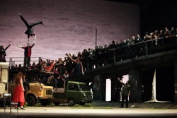 Словом, история, рассказанная в опере, еще раз осовременена, и, как часто бывает, «снижена». Не только цыгане, в спектакле Мартоне мелькают и путаны. В соответствии со «средой обитания» выполнены костюмы (художница Урсула Патцак), напоминающие разноцветные тряпки. В финале и без того плотная фигура сопрано Оксаны Дыки испорчена белым платьем, с которым совершенно не сочетается цветастый цыганский платок. Все это впрочем, детали. Главное в том, что подобные вещи были видены бессчетное количество раз.