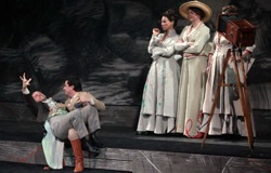 Алекс Эспозито (единственный итальянец в интернациональной, по преимуществу немецкоязычной компании), который заслуживает таких эпитетов, как «поразительный артист» или «феномен»,- его интерпретация роли Алидоро в «Золушке» на последнем Россиниевском фестивале незабываема, - не оказался столь же безупречным в роли Папагено. Его владение немецким языком, вокальное искусство, комический дар не могут быть предметами дискуссии. Но в роли Папагено артист предстает преувеличенно карикатурным. Мила его Папагена, ирландка Айлиш Тайнан.