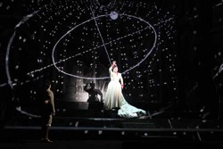 Кентридж особенно знаменит своими рисунками углем и анимациями, и в постановке «Флейты» демонстрирует свое тонкое, деликатное и «невинное» искусство во всей красе. Зритель приглашен на выставку, экспонаты которой, безусловно, имеют дело с волшебством: «задники» Кентриджа, не что иное, как проецируемые и «оживающие» рисунки, не влюбится в них только тот, кому природа начисто отказала в фантазии и любви к сказке. Царица Ночи появляется на фоне темного неба с мерцающими звездами (при внимательном рассмотрении понятно, что этот «задник» - негатив рисунка Кентриджа: художник провел черную линию по белой бумаге, а зритель видит белую линию на черной бумаге). Во время знаменитой арии «Der Holler Rache» во втором действии Вселенная взрывается, метеоры и кометы мелькают в стремительном темпе, сыплется космическая пыль. Тамино играет на волшебной флейте – под ее нежные звуки грациозно пляшет носорог, которому вес не мешает танцевать на передних лапах; под конец зверь улетает, подхваченный под пузо канатом. Вполне возможно, что ему уготовлен рай, какой именно, зритель может решить сам... Птицелов Папагено рисует своих подружек-птиц, которые немедленно оживают и начинают летать. Сцена Памины и похотливого мавра Моностатоса «дублируется» персонажами театра теней. Дорога Тамино и Папагено к замку Зарастро лежит через Млечный Путь. И что сказать о храмах, фантастических пейзажах, водопадах и пылающем огне? Рисунки Кентриджа один прекраснее другого и каждый из них хочется навсегда запечатлеть в памяти. «Волшебная флейта» - спектакль воистину редкой красоты! (Сценография создана в сотрудничестве с Сабине Тойниссен, и нужно отдать должное художнице по костюмам Грете Гойрис: вдохновленная моделями одежды конца девятнадцатого века, она одевает персонажей в элегантное и строгое платье, но использует нежные пастельные тона, которые создают ощущение теплоты).