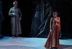 Зрелище же, созданное режиссером Фабио Спарволи, и вовсе неинтересно. Как если бы мановением волшебной палочки вас погрузили в то, что обозначается определением «провинциальный театр». Боязнь пустоты наравне с полным опустошением сценического пространства, мизансцены в полном согласии с рутиной, мелодраматически жестикулирующий хор, такие попытки «оживляжа», как бросание в воздух сверкающей пыли, сцены, кажущиеся взятыми напрокат из бытовой драмы или телесериала средней руки (особенно смешон Зурга, швыряющий табуретку в кулисы по окончании дуэта с Лейлой в третьем действии). Наконец, слишком назойливое участие кордебалета, нескольких девушек в восточных панталонах, напоминающих о «Баядерке», и раздетых до пояса юношей. Вряд ли можно назвать хореографией несколько па классического танца, пару поз, отдаленно напоминающих о танце индийском и особенно болтание в воздухе стройными ножками (автор – художественный руководитель веронской труппы Мария-Грация Гарофоли).