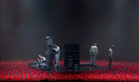 Так что особого разочарования постановка не вызвала. Правда, на сей раз предсказуемые постановочные нелепости дополнялись «изысками» сценографии – в роли художника-постановщика и художника по свету выступил сам Бернар. Декораций практически не было; действие происходило на фоне тряпочного полукруглого задника. Правда, в буклете режиссёр пытается убедить публику, что сия тряпка – это «парижское небо». Тем не менее, можно легко представить небо Петербурга, добавив силуэт моста, рисунок решётки Летнего сада или адмиралтейского кораблика; перекрёстные лучи прожекторов на тёмном фоне – и можно поверить, что мы видим небо блокадного Ленинграда; воображение легко дорисует остальное.