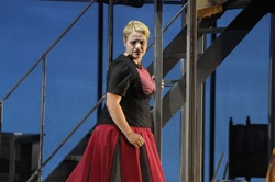 Режиссуру же трудно назвать даже «помехой» музыке, скорее это просто — плевок ей в лицо. Набор заезженных приемов, никак не сочетающихся с эстетикой Яначека (последний раз этот набор почти точь-в-точь я видел в местной постановке «Вишневого сада»: унылые конструкции из лестниц на сцене, постоянное присутствие всех персонажей, которые вынуждены на заднем плане уныло повторять какие-то условные монотонные действия, даже, видимо, обязательные для «русской действительности» возлияния и пошлые сцены с порнографическим уклоном, - в данном случае садо-мазо-развлечения Кабанихи и Дикого), с широким диапазоном от натурализма (блевание в стоящий на сцене унитаз) то слюняво-слащавой душещипательности (влюбленные на лестнице, ведущей прямиком к рождественского вида звездочкам на ночном небе).