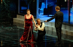 Рассматривая композиционные построения Херхайма, несложно принять собственные фантазии за режиссёрский замысел, но мне думается, я не сильно ошибусь, если предположу, что именно многоплановый образ Онегина, двойниками которого выступают и Ленский, и князь Гремин, и даже цирковой медведь, «оживающий» в воспоминаниях о праздновании Татьяниных именин в родительском доме, становится воплощением загадочности русской души. С Татьяной режиссёру всё ясно: пережив свои ожидания мужчины-спасителя, мужчины-бога, разочаровавшись и смирившись, главная героиня выбирает спокойствие предсказуемости, тогда как мечущаяся в поисках смысла своего существования душа Онегина обречена на вечную интерпретацию толпой мотивов своих поступков. Толпа судачит об Онегине во время бала у Лариных, толпа пытается угадать душевный настрой главного героя в предпоследней сцене, и это воздействие на русского человека мнения толпы очень грамотно акцентировано не только в постановке Херхайма, но и в работе оркестра под управлением Мариса Янсонса и хора (хормейстер Мартин Райт).