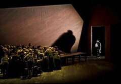 Неспокойна, волнующа, грозна, тревожна музыка Бриттена, воссоздающая штормовую морскую стихию, что, однако, абсолютно совпадает с концепцией Макфарлейна, выстроившего спектакль в угловатых пространственных конструкциях, таких же серых, как английское небо в ненастье, как одежды жителей, серые и приглушенные, как и сами персонажи, размытые и неразличимые, кроме разве тети, хозяйки местного отельчика Кэтрин Вайн-Роджерс и ее двух взбалмошных, вызывающе одетых племянниц. Возможных претенденток на новую травлю?