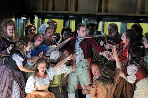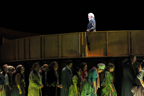 Такая опера, наверное, очень облегчает задачу режиссера: ему не нужно особенно погружаться в глубины и секреты музыки, - музыка слишком ясно тут следует за текстом, - а достаточно поставить драму. И режиссеру этой постановки, Александру Шулину, постановка очень удалась. Нервная, напряженная атмосфера от начала до конца, на грани гротескного кошмара и прозаического реализма, ясные характеры персонажей. Несколько четких, простых и вместе с тем очень выразительных находок, например — Дантон, произносящий свою оправдательную — скорее, обвинительную — речь перед Конвентом, даже на самом пике вдохновенного красноречия должен все время не забывать поддерживать спадающие штаны: ремень отобрали в тюрьме, - штрих, болезненно передающий состояние унижения и беззащитности.