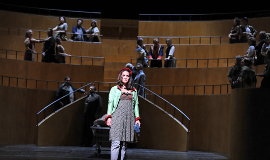 Исполнитель партии Дантона Штефан Штоль — один из лучших певцов в театре, запоминающийся в любой роли, прекрасно владеющий голосом, и при этом отличный актер. Вообще все в этой постановке приятно удивило: и оркестр под управлением капельмейстера Хохстенбаха играл исключительно точно и увлеченно, и, что совсем необычно для этого театра, и хор — а у хора в «Смерти Дантона» очень большая, серьезная и разнообразная роль — пел на очень высоком уровне. Все певцы показали себя с лучшей стороны; помимо Штоля на первом плане была Диана Томше, певшая Люсиль и во вступлении Рима и в самой опере Айнема, очень прочувствованно и убедительно.