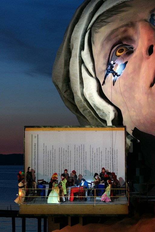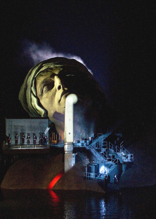 Как в случае с «Тоской» и «Аидой», для озерной сцены прежде всего создается колоссальное, сложное и незабываемое зрелище. Бизнес и искусство в Брегенце идут рука об руку (стоимость постановки около семи миллионов евро). Сценограф Дэвид Филдинг вдохновляется известной картиной Жака-Луи Давида «Смерть Марата», на которой запечатлен момент гибели «Друга народа» от руки Шарлотты Корде,- она хорошо известна тем, кто хоть мало-мальски знаком с историей Великой французской революции. Блестящая идея – трансформировать воды Боденского озера в «ванну» (правда, гораздо больших размеров), лежа в которой, Марат нашел свою смерть. Из вод Бодензее поднимается мертвый колосс высотой в 24 метра и весом в 60 тонн, с запрокинутой головой и закрытыми глазами (впоследствии зрителю предстоит испытать сильные эмоции, когда глаза откроются и покажутся полными мысли и страдания). Крутая и узкая лестница в 154 ступеньки спускается от его левого глаза по шее и груди, на правом плече «прикреплена» раскрытая книга со стихами Шенье, в которых он воспевает жест Шарлотты Корде – на этой сценической площадке поэт появится и споет «Импровизацию», она трансформируется в кафе, где он будет ждать Мадлен, а потом в камеру смертников. На уровне груди колосса – рука с письмом Шарлотты Корде, в виде плавающей платформы, место, на котором развернутся массовые сцены. Думаете, что вырастающим из вод озера бюстом Марата, лестницей, раскрытой книгой да плавающей платформой изобретательность сценографа исчерпывается? Ошибка. Революционный трибунал, приговоривший к смерти Андре Шенье, помещается внутри шеи колосса! Голова откинется назад наподобие взрезанной ножом консервной банки, и вашим глазам предстанут книги, много книг,- символ эпохи Просвещения. Частью инсталляции является овальная рама от старинного зеркала: элемент, особенно откровенно бьющий на эффект – внутри рамы будут кружиться акробаты, вздернуты на виселицу приговоренные к смерти, упадет окровавленная коса Смерти... Не забыта и смертельная рана, нанесенная Шарлоттой «Другу народа»: она отлично видна на скульптуре, а в последнем действии из вод Бодензее появится и нож, которым она была нанесена, из окошка в рукоятке ножа тюремщик Шмидт будет разговаривать с Мадлен и Жераром.