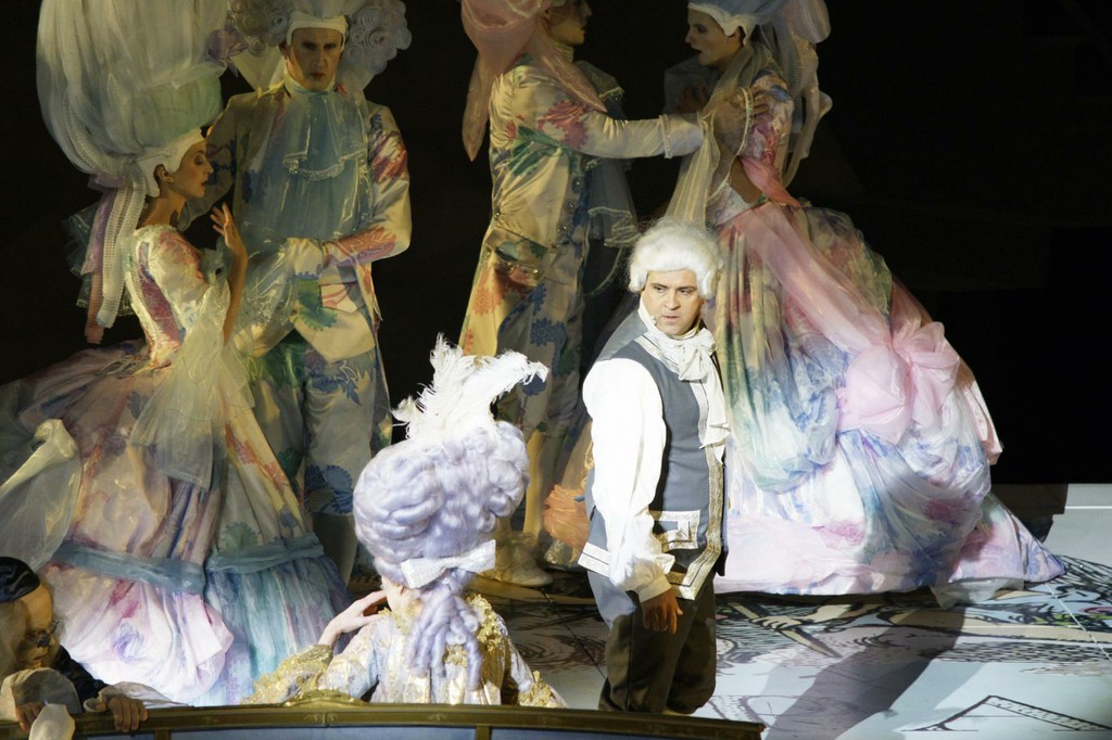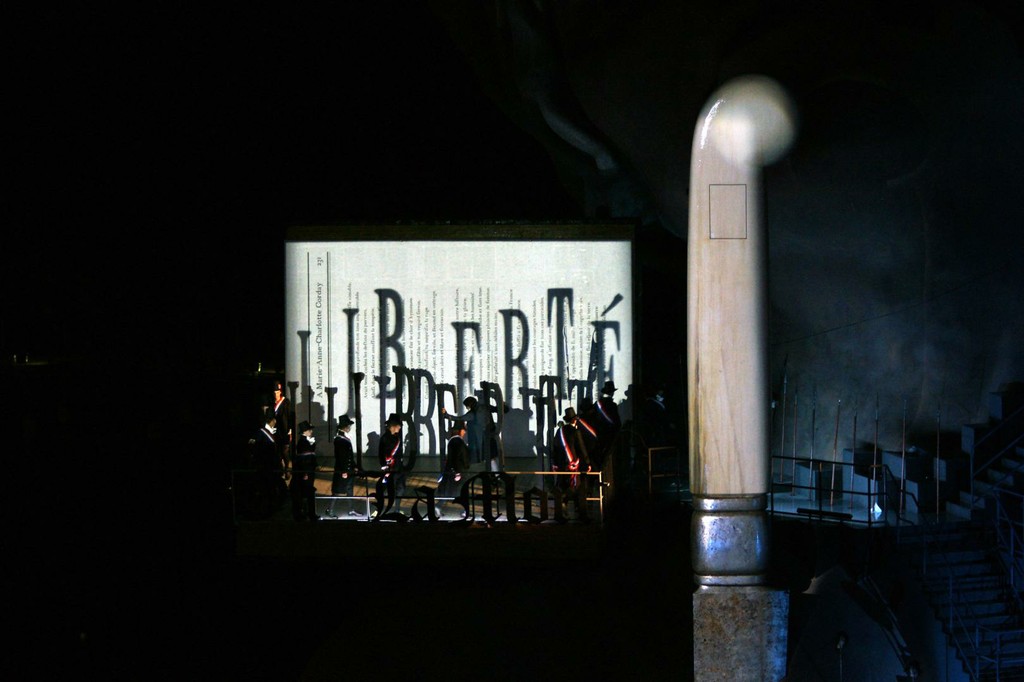 Спектаклю «Андре Шенье» можно посвятить целые страницы, но деталей так много, что многие из них несомненно ускользнут от зрителя и критика. Упомяну одну из них: с самого начала в постановке Уорнера присутствует образ Смерти, в первом действии она носит личину аристократа и с уверенным видом восседает на диване в салоне графини де Куаньи, а на протяжении остальных трех превращается в подобие Харона, который неустанно снует на лодке, приближая ко входу в мир иной приговоренных к смерти. Но многое и многое поразит зрителя: гавот и менуэт в хореографии Линн Пэйдж на макушке колосса (танцующие работают на лонжах, двое из них прыгают в озеро с огромной высоты), световые эффекты Дэви Кеннингема (голова колосса освещается то призрачно голубым, то кроваво-красным светом), около 500 костюмов и париков, созданных Констанс Хоффманн, активно задействованные артисты миманса и акробаты, выделывающие впечатляющие трюки и демонстрирующие немалую физическую выносливость,- они то подолгу сидят в холодной воде, то, имитируя трупы, «висят» на металлических «шипах», что появляются из головы и плеч колосса, наглядно изображая фразу либретто «революция пожирает своих детей».