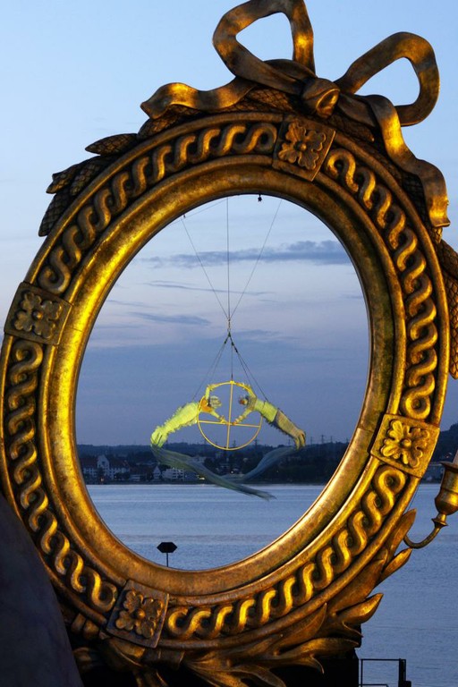 Если автору посчастливилось присутствовать на спектакле, озаренном светом звезд, то в вечер первого представления погода не была столь милостивой. Над Бодензее разгуливали угрожающие облака, а дождь прекратился только за пятнадцать минут до начала. Почти семи тысячам зрителям раздали бумажные салфетки, дабы они самостоятельно осушили жесткие кресла, и публика сидела в зале под открытым небом при температуре всего в 12 градусов, укутанная в пальто и одеяла, в то время как акробаты проводили долгие минуты в холодной воде озера. На премьеру прибыл президент Австрийской Республики Хайнц Фишер: открытие Брегенцского фестиваля, несомненно, событие первостепенной важности. Можно лишь подивиться трудолюбию и уму австрийского народа, сумевшему превратить каждый квадратный сантиметр собственной территории в нечто прекрасное, и из самой, на первый взгляд, незначительной вещи сделать нечто интересное и заслуживающее внимания. Площадь перед Фестшпильхаусом в Брегенце носит имя Венского симфонического оркестра, а в центре ее расположен небольшой водоем, собственно, просто крошечное углубление в асфальте, заполненное водой. Лужа, да и только. Так вот, масса народу сидит на стульях вокруг лужи и даже просто в луже, получая от этого удовольствие. Что же, в столице федеральной земли Форарльберг хороша и простая лужа.