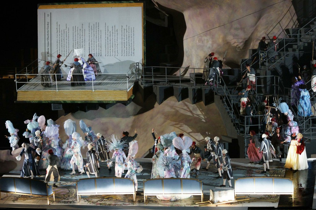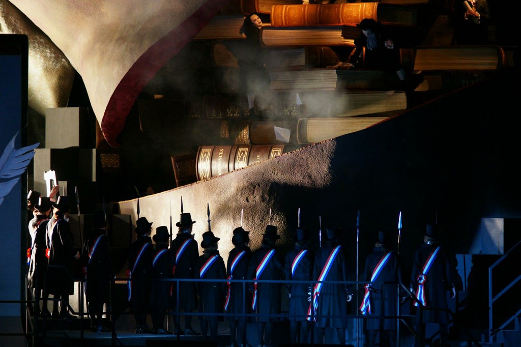 Если интереснейшие и эффектнейшие идеи сценографа все же поддаются описанию, изобретательность режиссера Кейта Уорнера может быть оценена как чрезмерная (этот «грех» был свойственен и «Аиде» Грэма Вика – Пола Брауна; при наличии самых зорких глаз и самой гибкой шеи уследить за всем происходящим было практически невозможно, а так хотелось!). В первом действии голова колосса покрыта куском белой ткани с тонким голубым рисунком, напоминающим о печных изразцах (размером в 1000 квадратных метров), как если бы революции еще только предстоит явить свой звериный лик. Плавающая платформа – аристократический салон графини де Куаньи, по лестнице снуют многочисленные слуги, по ней же спустится Жерар, представляя гостям-аристократам «Ее Величество Нищету», на верху лестницы ванна, в которой лежит Мадлен. Поэт Шенье имеет свою «среду обитания» и не смешивается ни с аристократами, ни с революционерами: книга – его мир, его любовь, его оружие. В конце первого действия платформа плавно «отъезжает» вправо, и на ней находят муку или смерть изысканные представители ancien regime, которых растерзывает восставший народ, срывая с дам парики и юбки, а кого-то сбрасывая в воду. Медленно ползет вверх светлая ткань, обнажая огромную ужасную мертвую голову Марата.