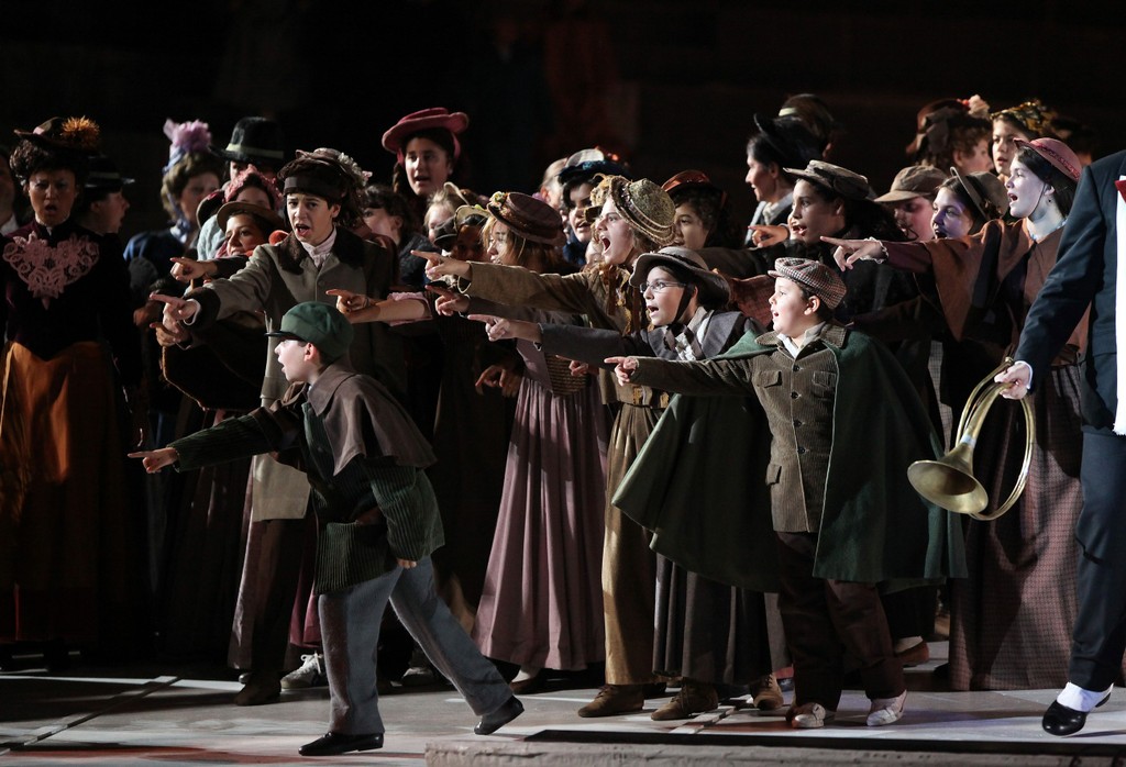 Орланди «заливает» огромное пространство чистым белым цветом: сценическая площадка «замощена» плитами, которые во втором акте, сцене рождественского праздника, вспыхнут теплым светом. Вечная зима — один из «фирменных» знаков «Богемы»? Символ чистоты молодых мечтаний? То и другое вместе? Доминирует легко узнаваемый силуэт парижской мансарды, а вся скудная обстановка жилища «четырех мушкетеров» также белого цвета: печка, кровать, пианино, стол и стулья. Забрались же они и в самом деле высоко: все персонажи появляются из-под подсвеченной дыры в полу. Во втором акте декорация Орланди напоминает ящик Пандоры, только сыплются из него него не все возможные несчастья, а театральные сюрпризы: одна из частей конструкции распахивается и оттуда «вываливается» все, что необходимо для шумного веселья накануне рождества, включая барную стойку кафе «Момюс». Как и положено в Арене, на сцену нагнано много народу, включая продавцов птиц, классических танцовщиц, жонглеров, артистов на ходулях и пожирателей огня. Все это задумки режиссера Арно Бернара, в обычном театре показавшиеся бы излишествами, а, может быть, и вовсе невозможные. Здесь же, в пугающе огромном пространстве древнего амфитеатра, большое количество статистов, присутствие цирковых артистов, красочное мельтешение уместны и вызывают у публики неподдельно радостную реакцию. А уж два «спецэффекта» улетающие в темное ночное небо разноцветные воздушные шарики и золотой фейерверк в самом конце и вовсе провоцируют восторг сродни соприкосновению с чудом театра в детстве...