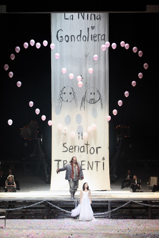 Условно-современный антураж, телефонная будка, фонарные столбы. Хор в блекловатых одёжках —привет из фильмов неореализма. Единственный весёленький элемент, обыграваемый на протяжении всего спектакля — воздушные шарики, много, девочково-розовые. Они даже умеют грамотно двигаться, и выстраиваются в сердечко! То, что шарики препротивно пищат иногда — гелий выходит, и свист не лучшим образом дополняет музыку, это ладно, переживём.