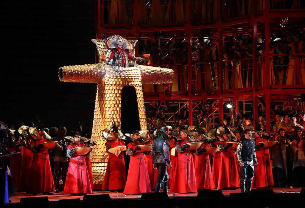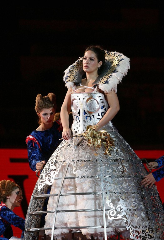 Две полукруглые трехэтажные лоджии в середине напоминают о шекспировском театре «Глобус». Они-то и «ездят» по ходу спектакля, «выгораживая» различные пространства для действия, внутри размещаются артисты хора. Впрочем, у Санки всё ездит: балкон Джульетты, дворцы веронского герцога и отца Капулетти, капелла отца Лоренцо, ложе двух влюбленных. Все эти конструкции золотого или серебряного цвета, а место венчания, напоминающее одновременно церковный купол, шатер или палатку, переливается всеми цветами радуги. Получается кич, но в корне отличный от десятилетиями торжествовавшего в Арене кича Дзеффирелли. Не обходится без лестниц, неподвижных и на колесах, они чуть напоминают о прославленных зданиях средневековой Вероны, одного из красивейших и наиболее романтических городов Италии. Заключительный дуэт несчастные любовники поют, помещенные на самом верху двух лестниц, которые неумолимо разъезжаются в стороны. Еще один «любимый» мотив Санки — клетка. В половинках круглой клетки погибают Тибальт и Меркуцио. Впечатляющий эффект производит платье-клетка, в которое помещают Джульетту в сцене свадебной церемонии; в клетке она и засыпает. На ступенях Арены — огромные полотна с репродукцией вида средневековой Вероны епископа Ратерия, изображениями пораженных любовью сердец и любовными надписями, все это как две капли воды похоже на то, что туристы неумолимо малюют на стенах так называемого дома Джульетты (на отмывание граффити мэрия Вероны постоянно отпускает немалые средства). Все довольно красиво, но красиво в смысле фразы Маяковского «Сделайте нам красиво». Постановка в духе кич не обходится без выезда царицы Маб на авто с крыльями летучей мыши, кричащих костюмов Сильвии Аймонино, задирания кверху ног артистов кордебалета в сцене бала (хореограф Никос Лагусакос) и рассчитана на вкус широких масс, которые летом посещают веронский амфитеатр.
