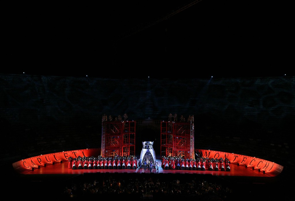 В Вероне фантазию на тему средневековой Вероны создает Эдоардо Санки. Сценография Санки чуть напоминает детский конструктор: она состоит из отдельных элементов, которые, двигаясь, производят шум, кстати, мешающий слушать музыку. Центральное пространство организовано наподобие стадиона, где вступают в жестокое противостояние Монтекки и Капулетти*, фамилии враждующих семей написаны огромными буквами на красном фоне.