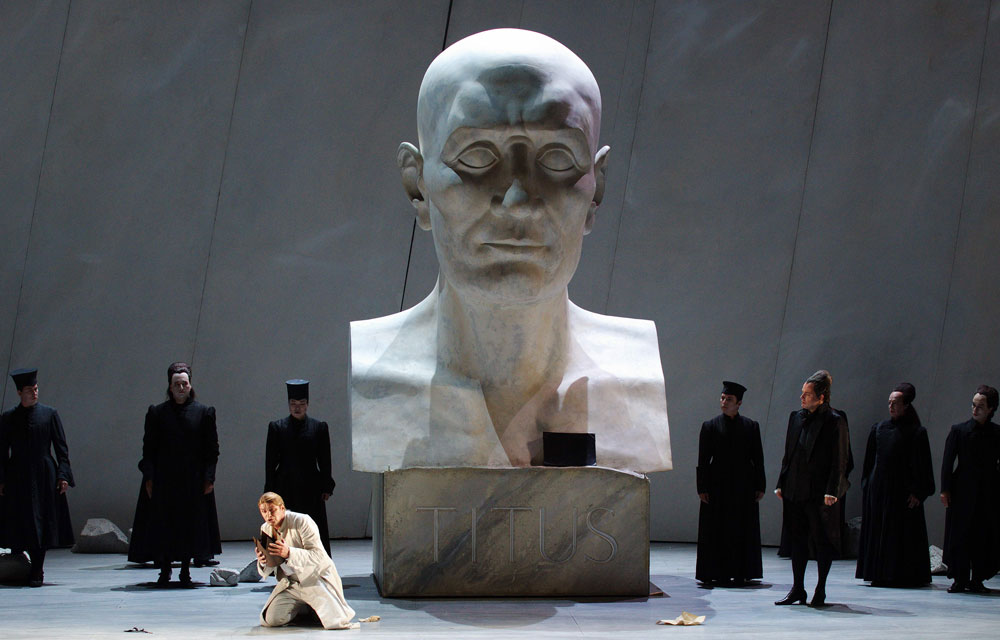 Моцарт, как известно, гордился тем, что им с либреттистом Катерино Маццолой удалось «из opera seria сделать vera opera», – сократить трехактный оригинал Метастазио до двух актов, деструктурировать строгую каноническую форму, введя в либретто дуэты, трио и ансамбли. Деккер, наоборот, seriaлизует постановку, словно быстрой линией отчёркивает эпизоды, почти после каждого ансамбля опуская занавес и выводя действие на авансцену. Делает он это из чисто технических соображений, за занавесом в это время происходят перестановки декораций. Сценография Джона Макфарлана предельно прямолинейна, как мораль басни. Мраморный куб занимает всю сцену при открытии занавеса: на нем в начале Публий процарапает имя Тита; постепенно, с каждой следующей сценой, от этой глыбы будет откалываться всё лишнее, мраморные осколки заполнят накренившуюся арену, чтобы в финале мы увидели уже готовый бюст Императора с высеченным и позолоченным именем Тита. Эффект неожиданности срабатывает только дважды: когда при поднятии занавеса после дуэта Секста и Анния Deh, prendi un dolce amplesso на заготовке обнаруживаются первые сколы, во второй раз – в финале, когда после квинтета героев в светлых костюмах на фоне светлого суперзанавеса Тит, «все знающий, прощающий и забывающий предательство», на мгновение оказывается, вместе с друзьями, перед толпой римских ликторов с белёно-розовыми лицами и в черно-черных одеждах, напоминающих причудливых феллиниевских венецианцев, жаждущих крови очередного врага. Занавес снова падает, и Тит, уже в полном одиночестве, обрушивается на землю под тяжестью императорской власти.