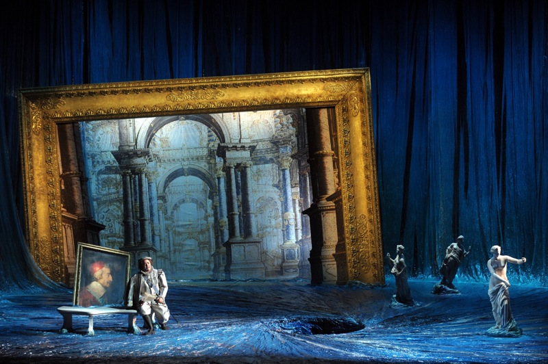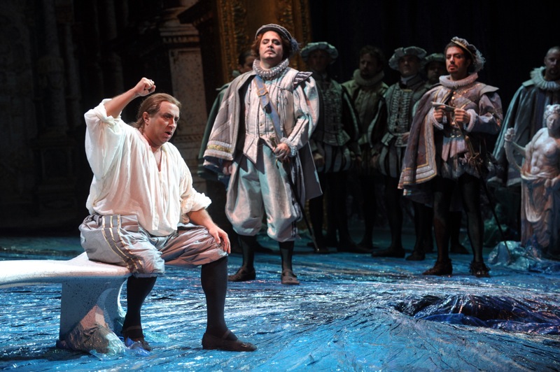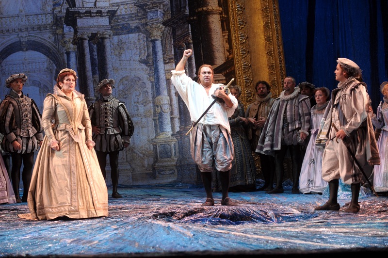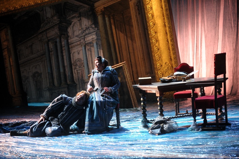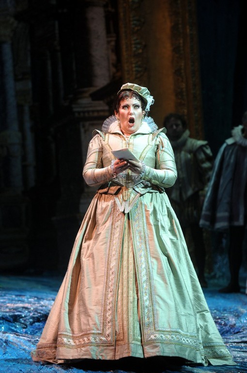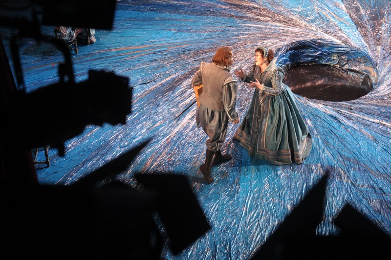 То, что предстало взору в окружении очень красивой рамы, коей является театр Доницетти, было в свою очередь очень красиво. Художник Анджело Сала затянул сценическую коробку, включая пол, в красивые драпировки голубого цвета, оставив свободным большое пространство в середине, где ткань уложена таким образом, что напоминает водоворот: намек на силу страстей, которые кипят в опере. Столь же красива и изысканна золотая рама с перспективой величественных интерьеров, откуда появляются и куда уходят персонажи. Рама наклонена, как если бы ее криво повесили нерадивые слуги, и с каждым актом все больше уходит в пол, как бы намекая на приближающийся трагический финал. Столь приятная глазу «картинка» таковой и остается, ибо режиссер Роберто Реккья не нашел ключа к одному из лучших драматических созданий Доницетти: спектакль не может состояться благодаря расставленным с правой стороны сцены предметам мебели и выходам артистов справа-слева... И световых эффектов (смена голубого цвета драпировок на ярко-зеленый и алый) слишком мало, чтобы живые картины превратились в спектакль.
