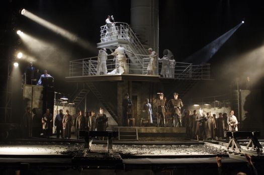 У меня есть ощущение, что ему, несомненно, понравилось бы, как бережно обошлись с оригиналом английские музыканты под управлением дирижера Ричарда Армстронга и режиссер Дэвид Паунтни. Декорации Йохана Энгельсa располагаются на двух уровнях. Нижний – ад Освенцима, с железнодорожными путями, ведущими к камерам смерти, платформами, периодически возвращающиеся с грудами вещей, принадлежавших смертникам, со ждущими своей страшной участи узниками: полячка Марта (Жизель Аллен), русская партизанка Катя (ее исполняет шведское сопрано Юлия Спорсен), чешская еврейка Власта (Венди Даун Томпсон), нашедшие пока свое временное пристанище на двухэтажных нарах. Верхний ярус – палуба белоснежного океанского круиза, достопочтенная публика 60-х годов в белых нарядах, танцы, коктейли…
