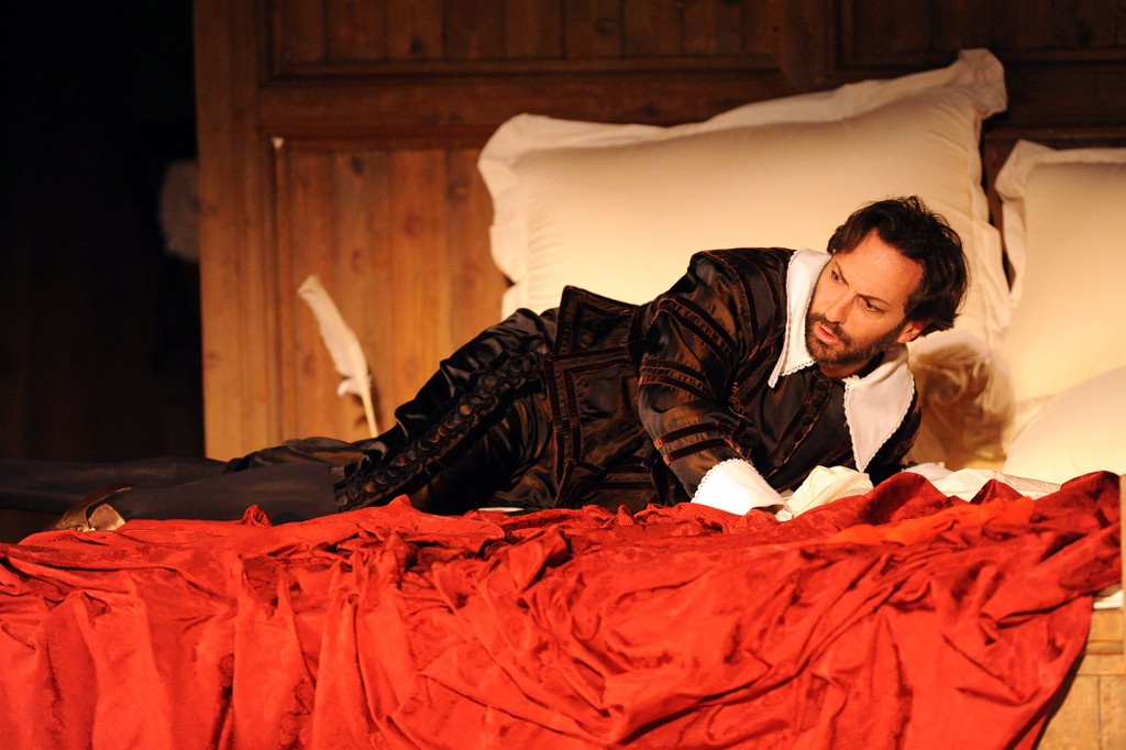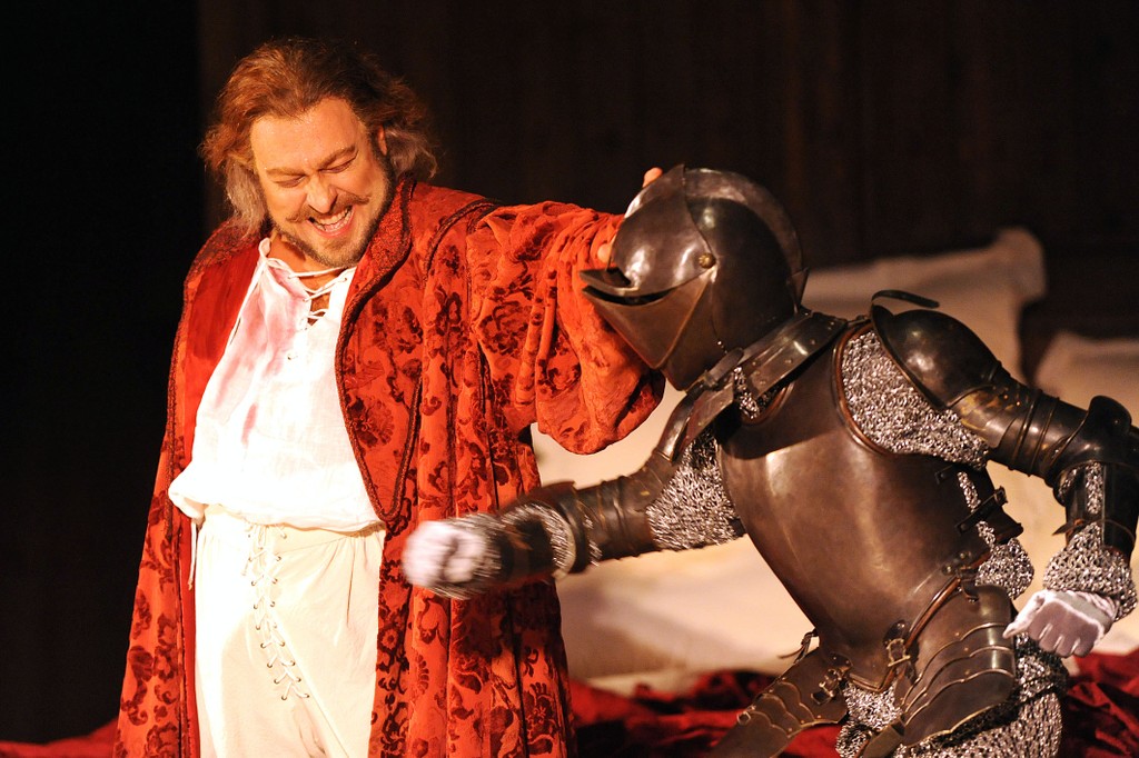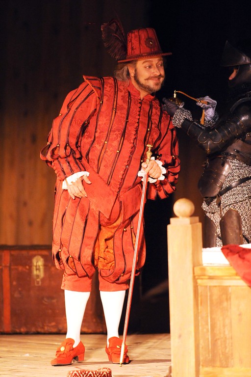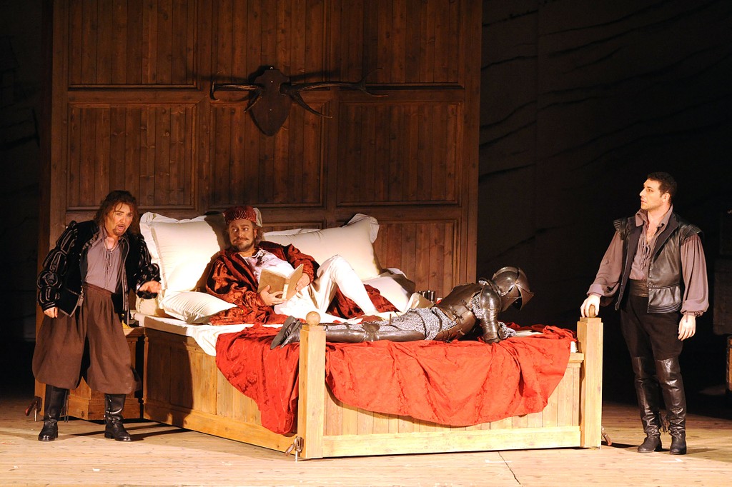 Сценограф Джеми Вартан не стал мудрствовать лукаво, а с гениальной простотой подхватил идею, которую подсказывает сам театр Фарнезе: дерево, дерево и дерево. На сцене все из дерева: огромнейшая кровать, на которой возлежит туша Фальстафа, дом мнимого рогоносца Форда, не говоря уже о дубе в финале, под которым происходит розыгрыш. С деревянной кровати начинают и деревянной кроватью заканчивают: это уже идея режиссера Стивена Медкалфа: ведь если «Все в мире шутка», так нечего и сердиться друг на друга, даже если главного героя истории и «замочили» в Темзе вместе с грязным бельем. Куда лучше помириться, собравшись в дружескую кучу на ложе толстяка Фальстафа! Кучей на кровати и заканчивается пармский «Фальстаф».