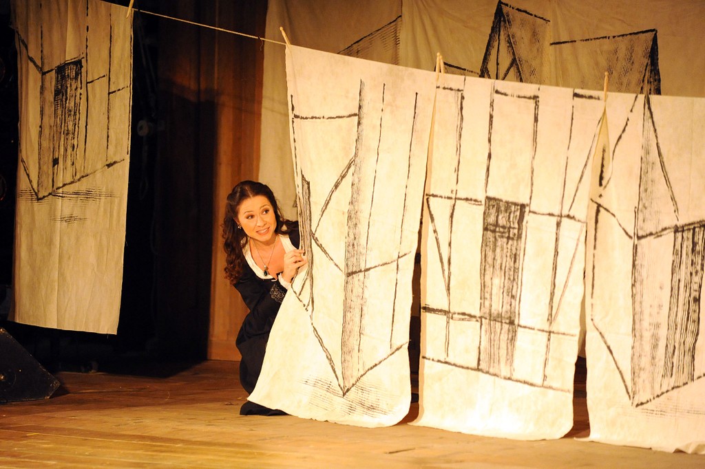 Почему я назвала статью «Белое пёрышко в чернильнице на деревянном столе»? Перышко, потому что спектакль легок, как перо, которым некогда водила рука композиторов, чернильница, потому что силуэты птичек, летающих над простынями, напоминают его росчерки, ну а из дерева сделаны театр Фарнезе и весь спектакль, который представил Вердиевский фестиваль в этом году...