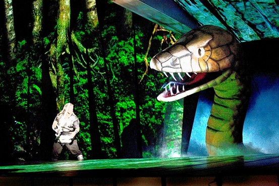 При минимальном декоре – полное впечатление, что вы присутствуете и в сказочном лесу, и в пещере, и пробираетесь вместе с героем через огонь и горы. Сцена – ряд мобильных «клавиш», нанизанных, как шашлык, на ось; каждая клавиша представляет собою независимый от других экран компьютера. Они могут выстроиться то ровным рядом, то встать частоколом, то нависнуть над персонажами сверху, то частично расступиться и изобразить вход в пещеру, при этом каждый раз передавая фон происходящей картины. Компьютерным операторам, работающим за сценой, удалось совместить на этих экранах театральную яркость и полную реальность изображаемого настолько, что когда персонажи шагают по такой «поляне», листья разлетаются у них из-под ног, а если они дотрагиваются до воды, то и вода идёт кругами. Есть и прелестная «живая» птичка, ведущая Зигфрида (поёт её за сценой Церлина из «Дон Жуана» - М. Эрдман), желтая, как иволга. Есть и дракон в пещере, и его меркнущие умирающие глаза, и медленно расплывающаяся по воде кровь. Есть всё – без всякого картонажа, марли и фанеры.