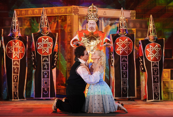 Зарастро и жрецы привнесли в звучание атмосферу, без которой любая сказка не может существовать: победа добра над злом, торжество справедливости. Вершиной провозглашения этой идеи стала ария Зарастро: «Свой храм, Изида и Озирис» (Егор Прокопьев).Надо отметить, что коллектив исполнителей «Зазеркалья» довольно молодой по составу, но, тем не менее, вокальные партии звучали очень профессионально и убедительно. Так же убедительно «колдовал» над оркестром дирижер Аркадий Штейнлухт.
