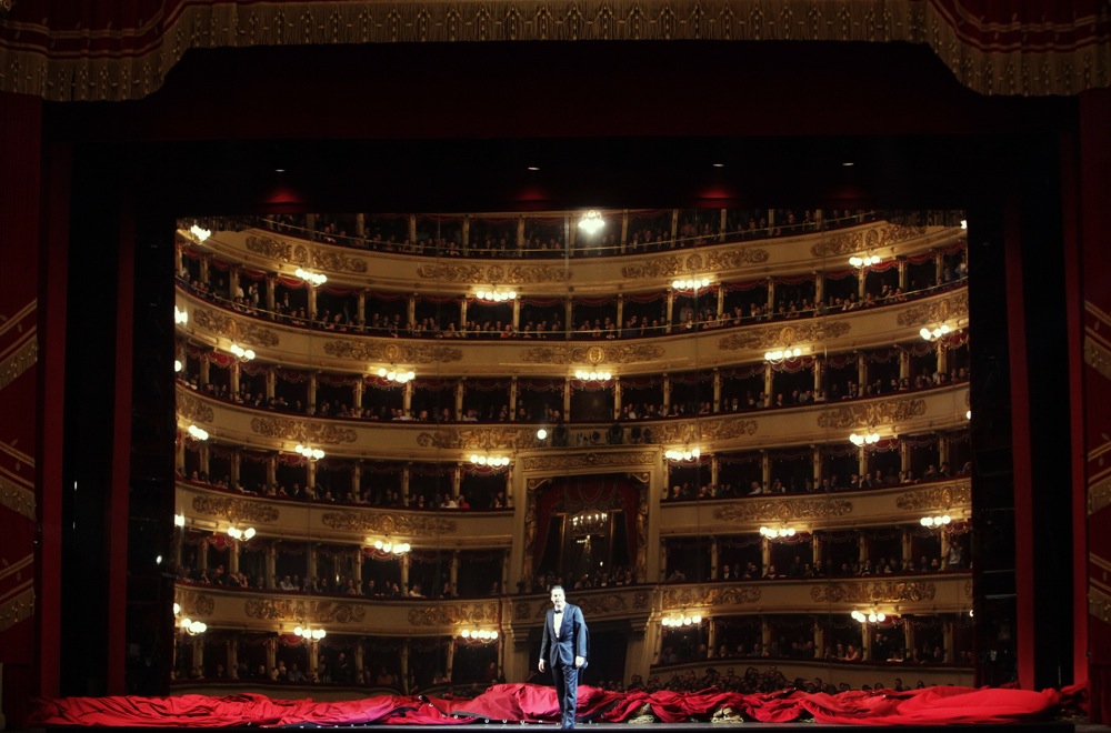 Инаугурация нового сезона «Ла Скала», как и обычно, состоялась 7 декабря, в день Святого Амвросия, небесного покровителя Милана – и все прекрасно понимают, что приуроченной к ней телетрансляции мы обязаны исключительно участием в постановке Анны Нетребко. Об ее весьма позднем дебюте в «Ла Скала» должен был узнать весь мир и, в особенности, вся наша необъятная страна, где любовь к певице – такой же факт массового «помешательства», как любовь к Николаю Баскову или Филиппу Киркорову. Начало мероприятия было назначено на 18.00 миланского времени, стало быть, по московскому времени трансляция должна была начаться ровно в 21.00 с трехчасовой разницей (ведь на зимнее время в этом году мы так и не перешли). Но «прямая трансляция» на телеканале «Культура» началась примерно в 21.30, поэтому уместнее будет назвать ее «кривой трансляцией» с задержкой начала на полчаса, однако на всем ее протяжении в правом верхнем углу экрана гордо красовалась надпись «прямой эфир». Заметим, что в последнее время подобные «фокусы» на нашем телевидении практикуются постоянно, правда, на сей раз формальным оправданием можно считать то, что показ изначально шел с русскими субтитрами (впрочем, это оправдание – очень формальное, так как технологии мультилингвальной поддержки субтитров во время прямых трансляций существуют в мире уже давно). Вы скажете, ну и что: подумаешь, разница в полчаса, но малое лукавство всегда, как известно, влечет за собой большие сомнения, ведь благодаря чудесам видеоинженирии в окончательном саундтреке всегда можно что-то подредактировать – прибавить или убавить, но сомнения на этот счет переводить в разряд подозрений, пожалуй, всё же не станем. Просто эти сомнения совершенно не следовало намеренно порождать – вот и всё! Раз уж анонсировали прямую трансляцию – уж будьте любезны прямую трансляцию и показывать!