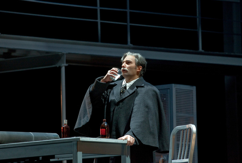 Хорошо, что раскрыли часто купируемую «беременную» арию, открывающую третье действие. Сгусток почти телесной усталости погрузневшего тела, тоска вместе с надеждой, страх и ожидание – всё воплощала модуляциями голоса, скупой здесь пластикой эта Маргарита. И не в момент гибели брата от руки возлюбленного сходит она с ума, и даже в бытово решённой сцене в Храме разум Маргариту ещё не покидает. Перелом наступает в момент, решённый броско и спорно – Маргарита, окружённая толпой «белохалатников» (врачей?) быстренько рожает – и тут же топит нарочито бутафорского куклёнка в раковине. Пожалуй, сыграть сумасшествие на сцене, тем более в изначально условном жанре, как опера или балет убедительно – одна из самых сложных задач. Актёрские жемчужины так редки, что о них вспоминают через поколения. Про Шаляпинских «мальчиков кровавых» царя Бориса можем судить только по аудио, до сих пор считается непревзойдённым сумасшествие Жизели-Улановой, запечатлённое на киноплёнке. Загадывать вперёд – трудно, но не удивлюсь, если следующим исполнительницам партии Маргариты будут, как пример, показывать Марину Поплавскую в финальной сцене оперы. Её крупный план, тихие потусторонние глаза, игра на полутонах с узнаванием-отталкиванием Любимого достойны элитарного кино.