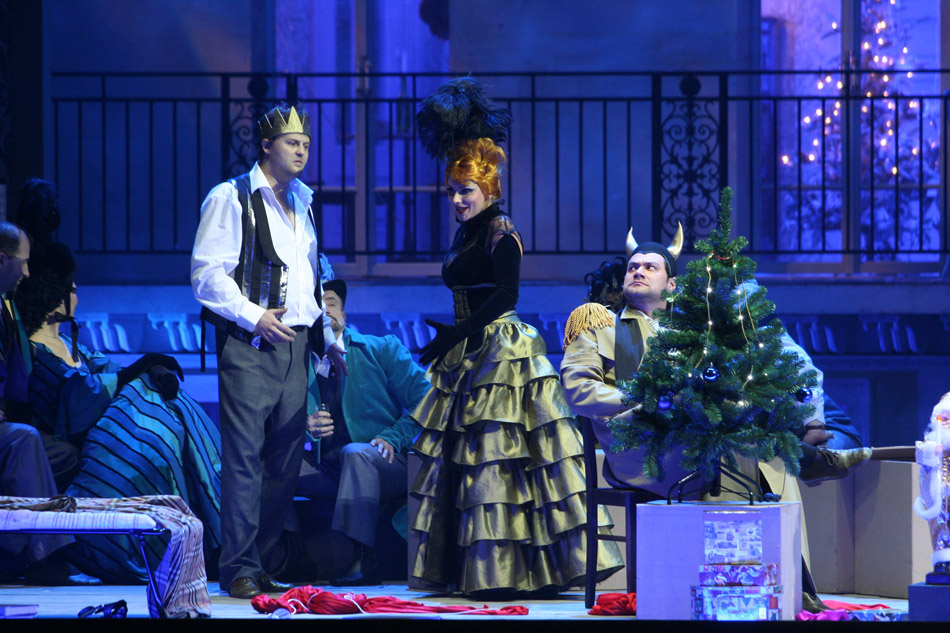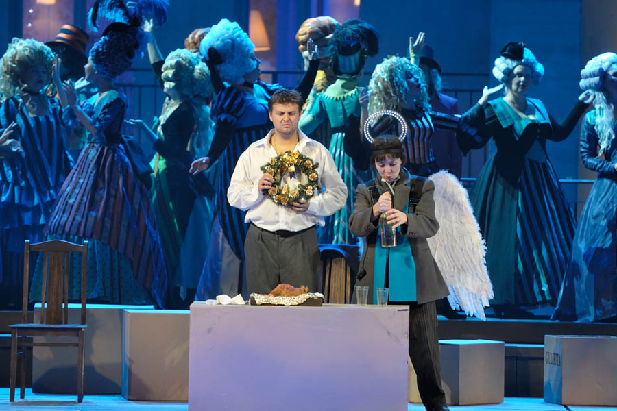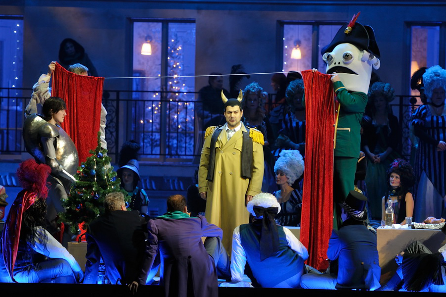 Например, о том, что советник Линдорф и юный Никлаус — всего лишь два alter ego, доброе и злое, в воспалённом сознании Гофмана. Или о том, что третье действие — «Джульетта» (данная постановка основана на версии Мишеля Кайе, в которой восстановлен авторский порядок актов (Олимпия — Антония — Джульетта), диалоги заменяют речитативы — прим. И.Ф.) — происходит не на балу в Венеции, а на рождественском представлении-маскараде в домашнем театре Гофмана.
