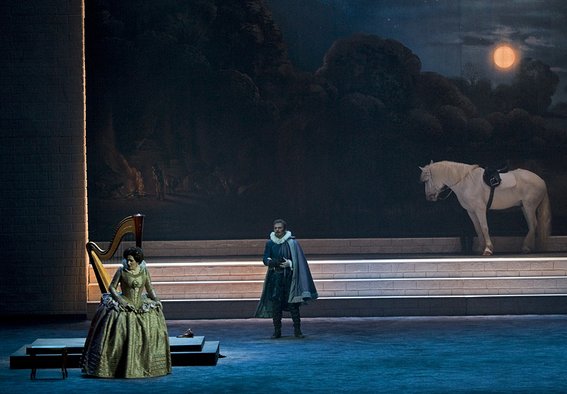 И что же нам явил Дунаев? Красивый тембр был на месте, техническая оснащенность и аккуратность тоже, и в лирических эпизодах все это было очень мило и красиво. Но на середине дуэта я поймала себя на том, что с увлечением разглядываю тихо возникшего на заднем плане белого коня, изящно и кротко помававшего передней ножкой. Живой конь, известная изюминка этой постановки, в этот раз, ей-богу, смотрелся как постмодернистская цитата из бесконечных анекдотов о живых лошадях в помпезных советских оперных постановках. Наблюдать за потешными экзерсисами коня было интереснее по очень простой причине: дуэту недоставало драйва. Эдгардо до уровня Лючии не дотягивал, звук был хоть и приятный, но несколько однообразный и какой-то на удивление позитивный, эстрадно-бодрый. Умилительное зрелище лошадки создало непрошеный комический эффект, снижающий и без того вялый драматизм любовной сцены. Вот уж действительно «шелковые панталоны, перо и кинжал»…