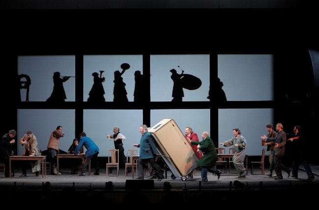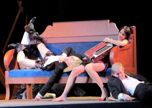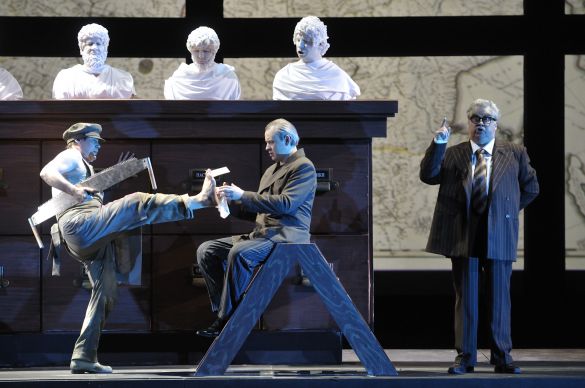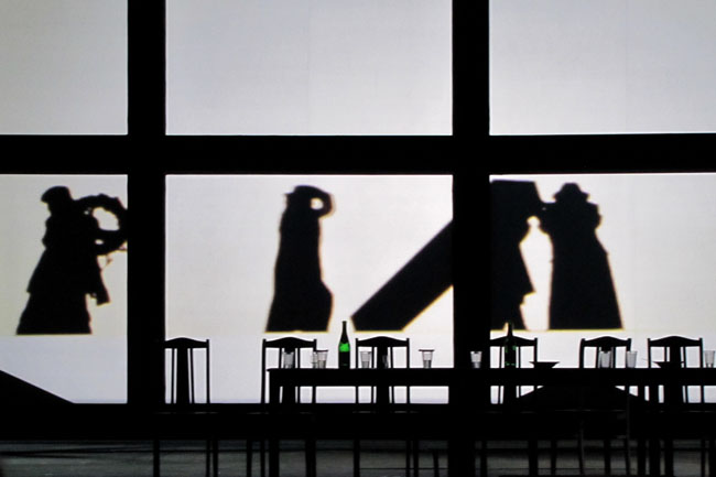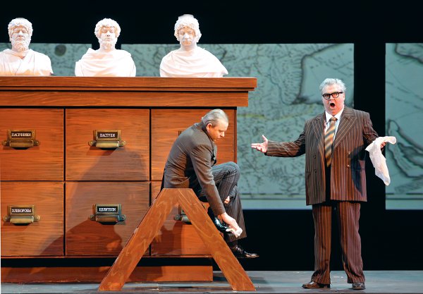 Не первый раз замечаю, что современные режиссёры, любящие сильно похулиганить в классических опусах и постебаться над Глинкой, Римским-Корсаковым, Оффенбахом или Штраусом, при встрече с опусами своих современников как-то сразу сильно пасуют и выдают спектакли более чем традиционные. С Василием Бархатовым и его партнёром-сценографом Зиновием Марголиным на моей памяти такое случается уже во второй раз: как и в «Братьях Карамазовых» три года назад, в «Мёртвых душах» весь «революционный задор» куда-то улетучился, и вниманию публики представлена самая что ни на есть типичная иллюстративная постановка, добротно, в полном соответствии с Гоголем, пересказывающая, словно прилежный школьник, содержание бессмертной поэмы. «Уши постмодернизма», словно «фиги в кармане», кое-где проглядывают, но по сравнению, например, с «Русланом и Людмилой» Чернякова — это просто невинные шалости.