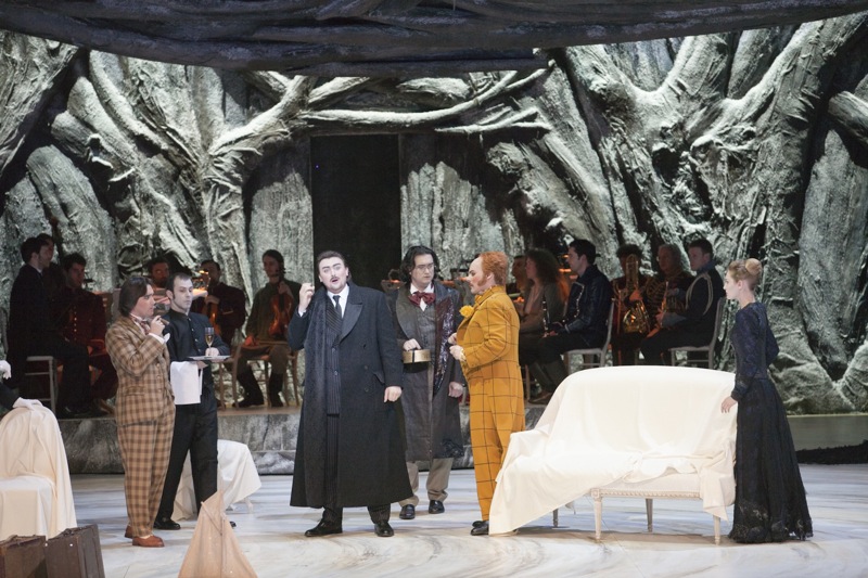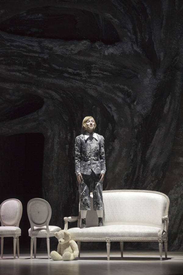 В новой постановке Парижской Оперы (сценография и костюмы Жана-Пьера Вергье) вместо вишнёвого сада на сцене — серый мрачный и тоскливый грот, образованный сплетением скрюченных стволов вековых дубов, разветвляющихся к верху множеством спутанных абсолютно голых веток: сад (или парк) мёртв уже при открытии занавеса. А то, что в пьесе Чехова цветущий и благоухающий сад явлен совершенно не случайно, что он всем своим видом — лучший контраст и лучшая антитеза психологическим состояниям главных героев, прежде всего Любови Андреевны Раневской — до этого современным постановщиком дела никакого нет. Дубовый грот на сцене Дворца Гарнье сильно смахивает на мультяшный лес или из компьютерной игры — с лабиринтами, таинственными и опасными местами, выскакивающими из-за ближайшего поворота неведомыми чудищами… И такие непонятные существа есть в спектакле: например, Раневской предназначен макияж вампирши и причёска Медузы-горгоны. Право, странный визуальный ряд для чеховской пьесы: куда больше, чем владелица вишнёвого сада, Раневская в этой постановке напоминает содержательницу публичного дома.
