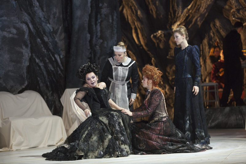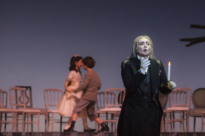 Режиссуру Жоржа Лаводена трудно назвать самостоятельной, но не его в этом вина — так написана опера: несколько полек и мазурок на балу, балерина, крутящая пируэты в стиле какой-нибудь феи Сирени (в данном случае, видимо, феи вишневого сада — самого сада нет, есть только эфемерная виллиса), в остальном же — это настоящий концерт, пастиччо из сольных фрагментов высказывающихся поочередно персонажей пьесы. Лишённые контекста, эти монологи оборачиваются томительным прослушиванием вокалистов — почти как на вокальном конкурсе, разница лишь в том, что вместо Россини, Верди и Пуччини певцы поочередно исполняют арии одного и того же композитора. Режиссёр лишь перемещает затемнённые силуэты солистов по скудно меблированной сцене подобно фигурам на шахматной доске — разводками всё и ограничивается.